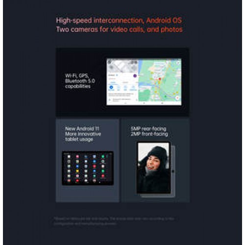 Android 11 SystemThe new Android 11 OS decreases mounts of storage space required for apps and improves runtime device performance. Spreadtrum SC9863A 1.6GHz CPU ProcessorUNISOC SC9863A is a highly integrated SoC platform that supports TDD-LTE, FDD-LTE, TD-SCDMA, WCDMA and GSM modes. It equips Octa-core ARM Cortex™-A55 application processor and GE8322 for 3D graphics acceleration. 4G LTE NetworkSupport TDD+FDD 4G network and SIM card slot. GSM: B3/5/8 WCDMA: B1/5/8 TDS:B34/39 FDD-LTE: B1/3/5/7/8/20/28AB TDD-LTE: B38/39/40/41 10.1 inch Full HD IPS Screen1920x 1200 resolution brings you high contrast and more vivid visual experience. 6GB RAM 64GB ROM 6G large RAM to keep system running properly. Also 64G ROM can fully support all your apps and media needs. Dual Band 2.4GHz / 5.0GHz WiFiMore bands for you to choose. 2.4GHz Band is better at penetrating obstacles while 5GHz band will offer faster connection speeds. GPS FunctionProvide accurate location service for you.