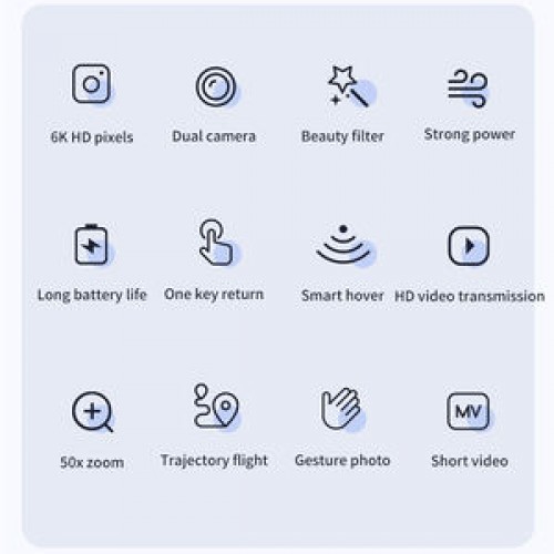 Product Description | No.: V14 Frequency: 2.4G Channel: 4ch Gyro: 6 A XIS Quadcopter battery: 3.7V 1600mAh lithium battery (included) Transmitter battery: 3 x 1.5 AA battery (not included) Charging time: 60-70mins Flight time: 16-20 minutes Drone weight: 94.8g (with battery) Remote control distance: 100m Colour: Black Camera: 720P/1080P/4K 1080P HD Dual camera/4K HD Dual camera Quadrilateral size:26*26*10cm - Has a high hold mode function to provide stable flight. - With wifi function, you can connect to APP, APK system to take photos, video, and transfer images in real time through mobile phone camera. - With gestures to take photos. mv music editing features. - There are 3 cameras to choose from. Equipped with a 720P/1080P/4K wide-angle camera for a wide range of high-definition pictures and videos. - No head mode, no need to adjust the aircraft position before flight. - With a one-button return function, you can easily find your way home. - Anti-interference uses 2.4GHz technology. - 4 channels that can be raised, lowered, forwarded, retreated, left-handed, right-handed and 360° rolled. - Six-axis gyroscope for more stable flight and easy control. - The four-rotor body is made of high-strength and engineering-resistant plastic, lightweight and durable. | ||||||