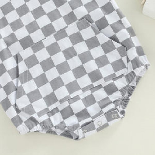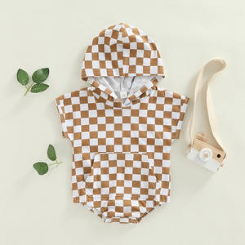 Custom Infant Stylish Checkerboard Print Short Sleeve Hooded Bottom Snap Closure Baby Cute Breathable Bodysuit