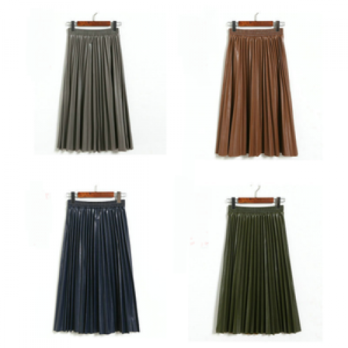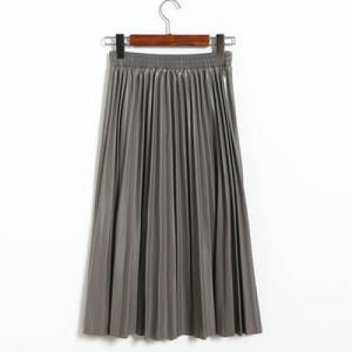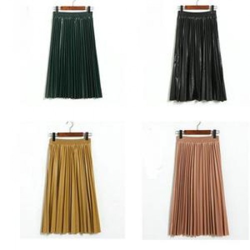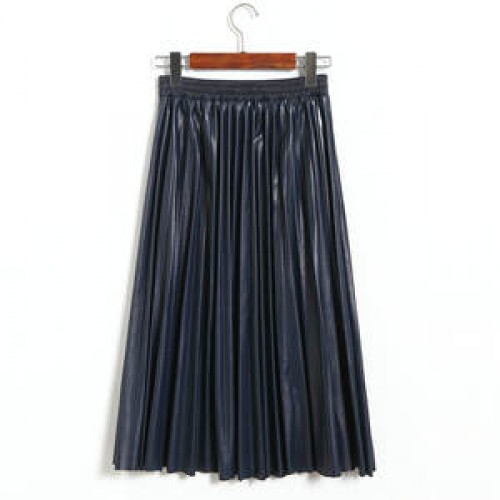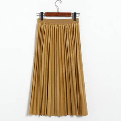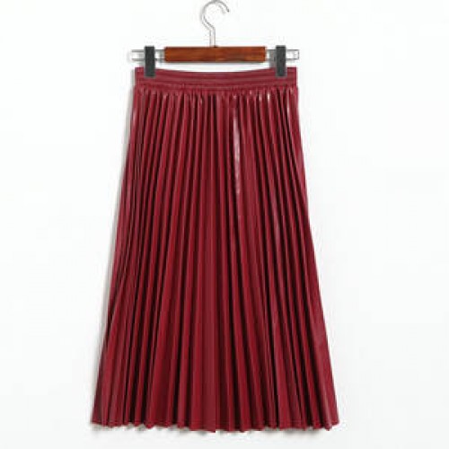 Autumn Winter Women Midi-Calf PU Leather Elastic Waist Pleated Skirts Office Ladies High Waist A-Line Harajuku Midi Skirts