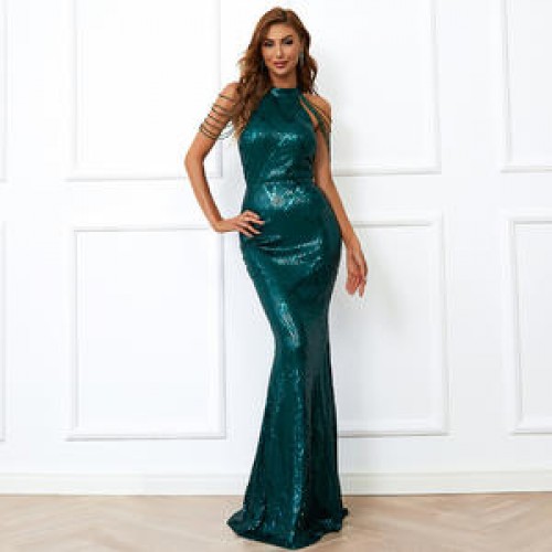 2022 Sleeveless Halter Gold Sequins Gowns Mermaid Tassel Bride Wedding Evening Dress Evening / Formal Dresses Party